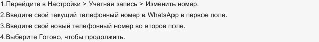 Для Андроид (Android): идем в Меню, далее - в Настройки, потом в Аккаунт, находим Изменить номер, затем вводим старый номер, а после во втором поле вводим новый. Всё!
