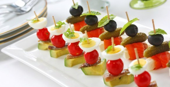 Канапе можно сделать с овощами, кусочком отварного картофеля или сыром, колбаской, кусочком сала: