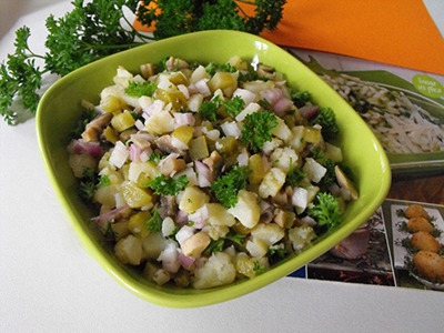 И, разумеется, солёный огурец хорош в качестве компонента салата, так называемого "новогоднего оливье", содержащего отварной картофель, ветчину, зелёный горошек, отварное яйцо и "самого себя", солёный огурчик).