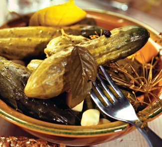 К соленым огурчикам "в компанию" хорошо подойдет печеная картошка, запеченное мясо и сало, лук и чеснок. И графин холодной водки. Если есть оливки, тоже давайте. Грибочки маринованные тоже гармонично впишутся в общую картину.