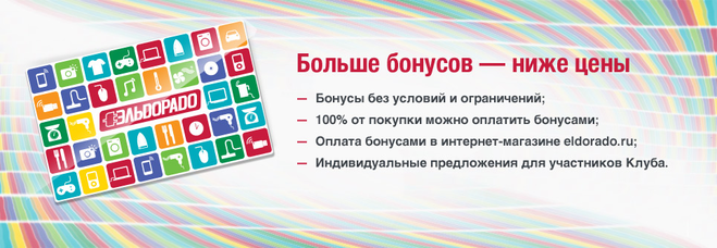 Причём бонусами можно оплатить хоть 100% от стоимости покупки. Вот только товара в Эльдорадо за 200 рублей не так уж много, поскольку это сеть магазинов бытовой техники...