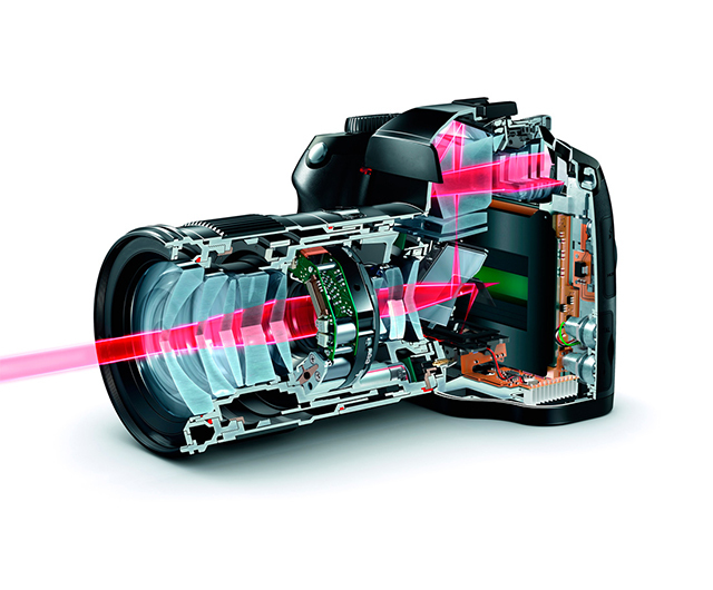 Смотрим рисунок. Внутри камеры есть матрица (раньше была плёнка, фотопластинка и т.п.) - в неё красный луч сходится. Сам этот луч демонстрирует оптическую ось всей этой системы линз и прочего. То есть, по-простому, это линия, куда фотоаппарат смотрит. Где-то там впереди находится то, что мы фотографируем. И, повторяю, эта самая точка, находящаяся в центре кадра, а также всё то, что лежит в плоскости, параллельной плоскости матрицы и находящейся на том же расстоянии, будет одинаково самым резким. Но по мере удаления от точки фокусировки - и вперёд, и назад - объекты на снимке всё больше и больше размываются.