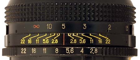 Сверху - шкала дистанции. Ниже - риска, означающая дистанцию фокусировки, а слева и справа как раз шкала ГРИП. Означает она вот что: при таком-то значении диафрагмы зона резкости будет в пределах от и до. Поэтому там у каждого значения диафрагмы две отсечки, слева и справа - "вперёд" и "назад" от точки, на которую вы навелись. Нетрудно заметить, что при закрытии диафрагмы ГРИП увеличивается. Так, находясь от объекта съёмки на расстоянии 5 м, при относительном отверстии 2,8 мы получим резким всё в пределах от 4,5 до 6 метров. Но стоит закрыть диафрагму до значения 16, и резким окажется всё от 3 метров аж почти до бесконечности, несколько десятков метров точно будут наши. Опять же, не только непосредственно на оси, а между плоскостями, параллельными матрице/плёнке. Потому и говорят не просто о расстоянии, а о пространстве.