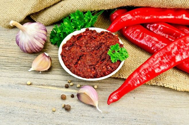 Чёрный перецц и специи из чеснока и красного стручкового перца в сочетании с болгарским перцем, пропущенные через мясорубку. Получается очень вкусная приправа к любому блюду.