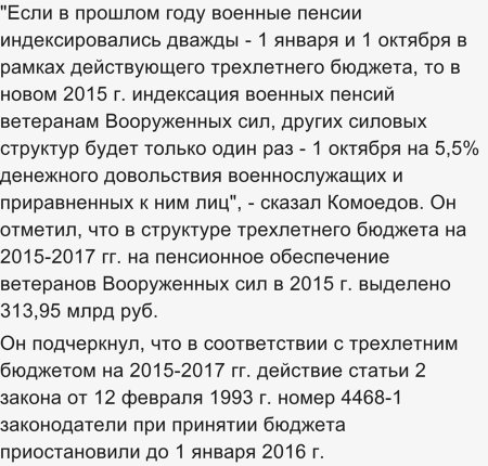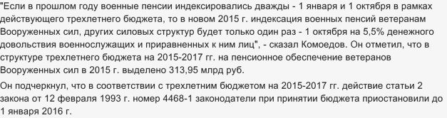 В 2015-м году военные пенсии будут повышены только один раз - первого октября, размер индексации составит 5, 5 %. Ранее индексация проходила два раза - в январе и октябре, но теперь ситуация изменилась - об этом поведал адмирал Владимир Косоедов - глава комитета по обороне в Государственной думе.