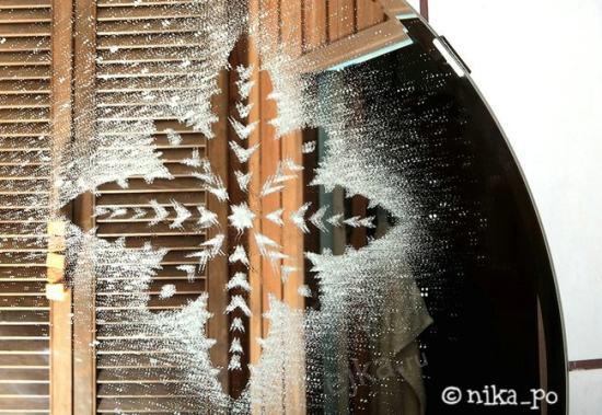 Можно безопасно для стекол также рисовать узоры зубной пастой (этот способ, кстати, очень нравится детям- они могут сами участвовать в раскрашивании окон).
