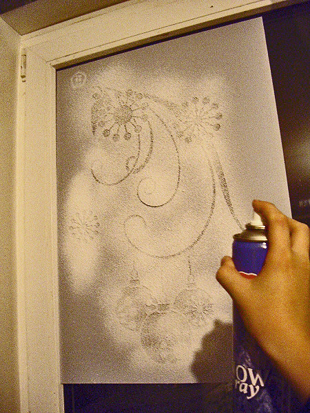 Для начала нужно заготовить трафарет с желаемым рисунком приложить его к стеклу и распылить снег сверху на лист.