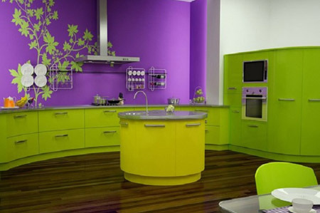 мне очень нравится сочетание салатового и фиолетового, выглядит очень ярко и интересно. Когда-то поэкспериментировали, пришла в салон делать маникюр, сказала:"хочу, что-нибудь необычное, яркое" и сделали такое сочетание. Всем очень понравилось. Другое дело, конечно же оформить комнату (это не ногти на пару недель сделать)