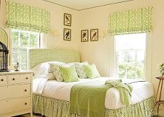 Например салатовый цвет с белым-вы можете взять за основу зеленый цвет, а белым цветом добавить акценты в виде занавесей, или пастельного белья, или каких-нибудь комнатных атрибутов. Вот примерно как на картинке. По-моему смотрится очень красиво.