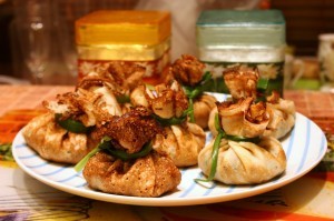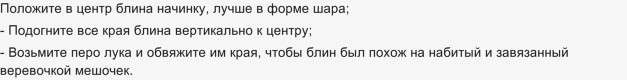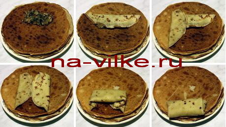 Вы можете после приготовления удобным и подходящим образом сложить блинчики с начинкой.Очень популярен мешочек,который завязывается зеленым луком.