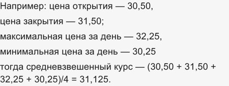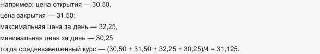 Для определения средневзвешенного курса доллара на практике обычно применяют следующий метод - определяют среднее число между ценой при открытии, ценой при закрытии, максимальной и минимальной ценами.