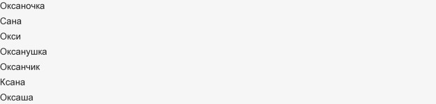 Хотя считается, что имя Оксана и имя Ксения это совершенно разные имена. Тем не менее Окасану, как и Ксению, частенько называют одними и теми же уменьшительно ласкательными именами.