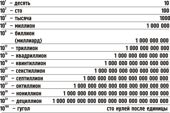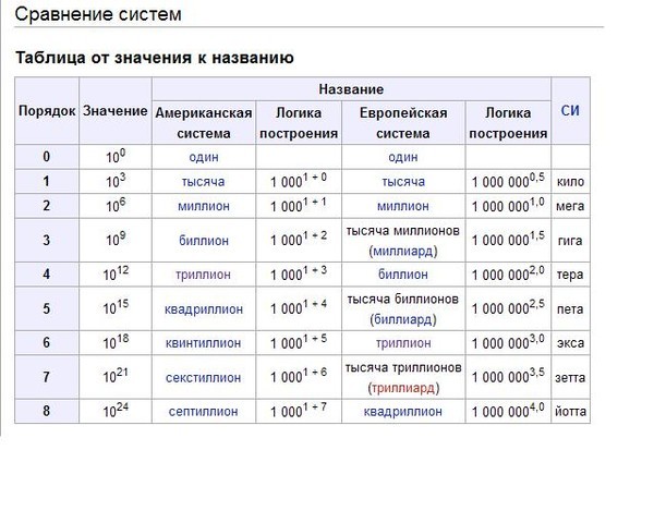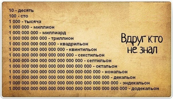 В обычной жизни мало кто пользуется числами больше чем миллиард, но каждый человек хоть раз задумывался о том, что же идёт дальше, как называются эти громадные числа. А названия у них такие (в скобках количество нулей):