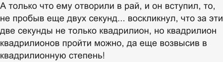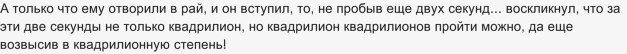Один из персонажей Достоевского (выдуманный Иваном Карамазовым) ради того, чтобы попасть в рай должен был пройти квадрильон километров. Сперва он отказывался делать это, но, так как перед ним была целая вечность, а делать все равно было нечего, все же прошел. А, пройдя, почувствовал себя так: