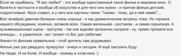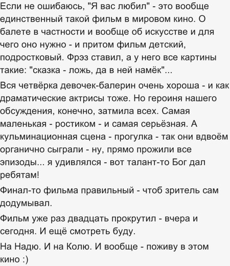 Виолетте было девятнадцать лет и она ещё не окончила бывшую "Танцовальную Ея Императорского Величества школу"  - Ленинградское хореографическое училище имени  Агриппины Вагановой, когда режиссёр пригласил её на эту роль, и мужская половина отечественных киноманов сразу же влюбилась в светлый, чистый, одухотворённый и трепетный образ Наденьки до потери пульса, - они и сейчас пишут ей на разных форумах признания, называют символом женственности, воплощением изящества, поздравляют с каждым днём рождения, - наверное, актриса и балерина их видит, но не отвечает -
