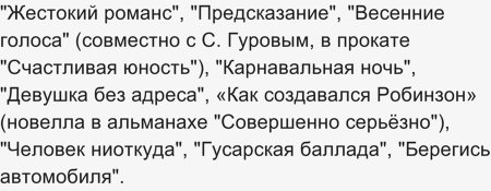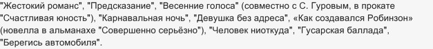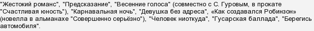 "Зигзаг удачи", "Жестокий романс", "Предсказание", "Весенние голоса" (совместно с С. Гуровым, в прокате "Счастливая юность"), "Карнавальная ночь", "Девушка без адреса", «Как создавался Робинзон» (новелла в альманахе "Совершенно серьёзно"), "Человек ниоткуда", "Гусарская баллада", "Берегись автомобиля".
