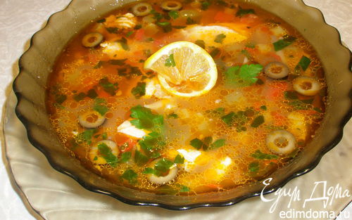 Снимаем с огня и даём супу настояться, а затем можно разливать по тарелкам, добавив дольку лимона.