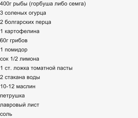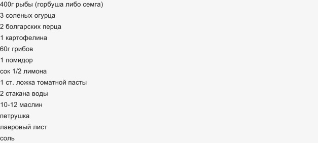 Для приготовления этого вкусного супа, нам нужно : 400 грамм горбуши или семги, 3 солёных огурца, 1 клубень картофеля, 1 помидор, 60 грамм грибов, сок 0,5 лимона, 1 ст. ложку томатной пасты, 2 стакана воды, 10 - 12 маслин, петрушка, лавровый лист, соль.