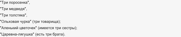Сказки, где три героя: "Три поросенка", "Три медведя", "Три толстяка", "Три богатыря", "Три апельсина" (их искал королевич), "Генерал Фанта-Гиро" (три дочери и три трона); "Ольховая чурка" (три товарища); "Аленький цветочек" (три сестры и три подарочка); "Царевна-лягушка" (три брата).