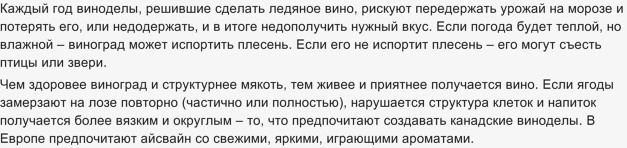 Ice wine (ледяное вино) тоже ценится выше классики. Виноград для него отжимается именно в замороженном состоянии, а замораживается прямо на лозе. Сахар и другие вещества, в отличие от воды, не замерзают. Поэтому вино получается концентрированное и сладкое. Но отжать можно меньше, чем обычно. Рислинг, грюнер вельтлинер, вельшрислинг, гевюрцтраминер, шардоне, совиньон, видал блан, из красных используют мерло и каберне совиньон.
