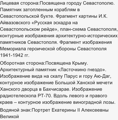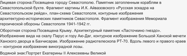 На одной стороне купюры "Крым 2015" изображен памятник архитектуры "Ласточкино гнездо", находящийся в Гаспре. На другой - Памятник затопленным кораблям в Севастополе. Он был воздвигнут в 1905 г. в честь 50-летия Обороны Севастополя. Также на ней виден фрагмент картины И.К.Айвазовского "Русская эскадра на Севастопольском рейде".
