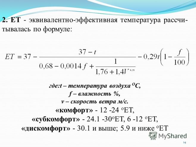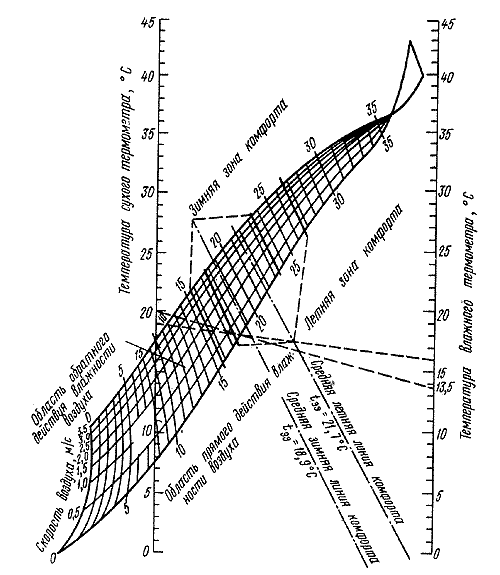 Кроме прочего, существует еще номограмма эквивалентно-эффективных температур, которая позволяет быстро высчитать эту температуру исходя из показаний приборов (срочный термометр, флюгер и гигрометр).