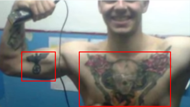 На реглане одного из бойцов АТО, как выяснилось, изображен логотип дивизии СС «Метрвая голова» со свастикой. При этом сам «герой» с обнаженным торсом, на котром выколота свастика, рассказывает свою историю каналу «1+1″.