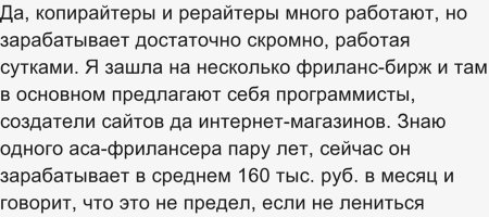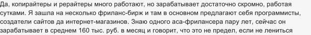 Да, копирайтеры и рерайтеры много работают, но зарабатывает достаточно скромно, работая сутками. Я зашла на несколько фриланс-бирж и там в основном предлагают себя программисты, создатели сайтов да интернет-магазинов. Знаю одного аса-фрилансера пару лет, сейчас он зарабатывает в среднем 160 тыс. руб. в месяц и говорит, что это не предел, если не лениться— 9 лет назад