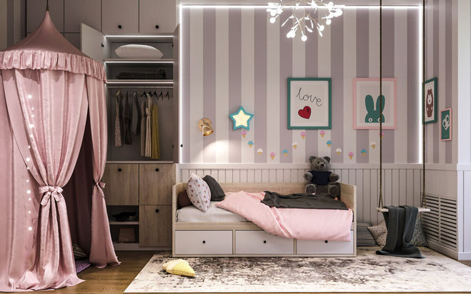А для детской хорошая идея - наклейки на стену. Их куча на Алиэкспрессе, и стоят они недорого. Единсвенный минус, придется подождать.
