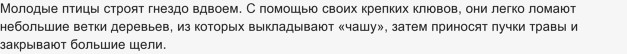 Когда парочка создана, то птицы возводят гнезда, соблюдая правила маскировки. В таких домиках самке должно быть удобно высиживать яйца и обхаживать детенышей. Птенчиков родители кормят и учат летать.