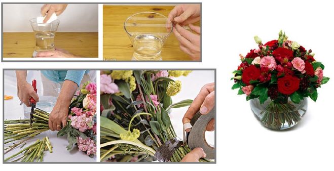 Флористы на торжествах очень часто украшают столы цветами. Ваз много и цветов, соответственно, тоже нужно много. Так вот, чтобы использовать поменьше цветов для каждой вазы и в то же время создать эффект того, что в каждой вазе стоит пышный букет, флорист делает на каждом горлышке вазы сетку из полосок прозрачного скотча и в каждую из ячеек ставит цветы. Они при этом не падают и букет приобретает округлую (классическую) форму, а вазы, даже с самыми широкими горлышками выглядят абсолютно наполненными цветами.