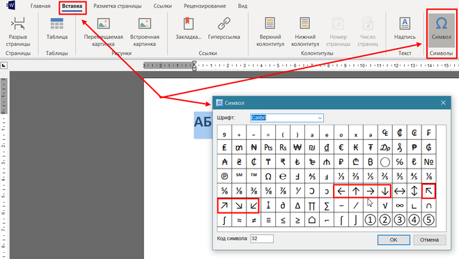 Если вам нужно вставить стрелку, перейдите во Вставка, можно посмотреть в Фигуры или, если это вас не устроит, то выберите Символы. Там тоже есть стрелки. Если же и это вас не устроит, то нарисуйте сами в Paint и вставьте рисунок в текст.