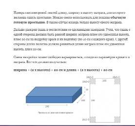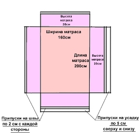 Итак, берёте длину и ширину матраса, и к этим размерам прибавляет по 20 сантиметров для загиба и подшива резинки.
