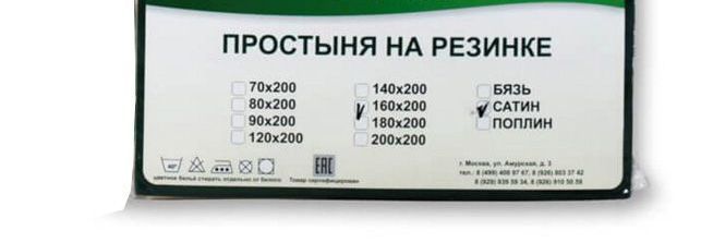 Простынь на резинке удобна тем, что она не скатывается и не надо ее поправлять регулярно. На упаковке от простыни пишут размеры. Для того, чтобы правильно подобрать простынь, надо знать размеры своего матраса. На многих простынях указывается, для какого именно матраса простынь. Вот пример (галочка поставлена у размеров 160 на 200 при высоте до 25 см):