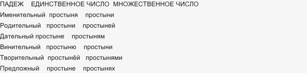 Прежде всего обратила внимание на само ключевое слово "простынь". В такой форме оно используется в разговорной речи, нормативной же,закреплённой в словарях,является форма "простыня" (извините за поправку - издержки профессии)). Парадигма склонения будет выглядеть так: