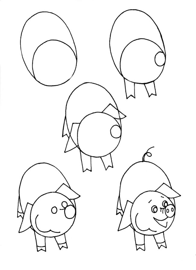В виде овала изобразите туловище, потом сбоку - пятачок. Далее - ушко, глаз и ножки. Затем хвостик крючком и не забываем про копытца. Обводим и рисунок готов!