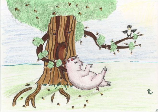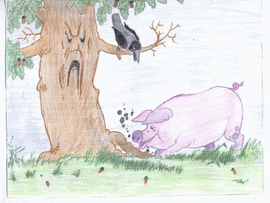 Мне очень понравился рисунок к басне "Свинья под дубом", выполненный школьницей Кривогородцевой Настей.