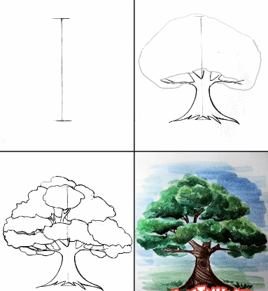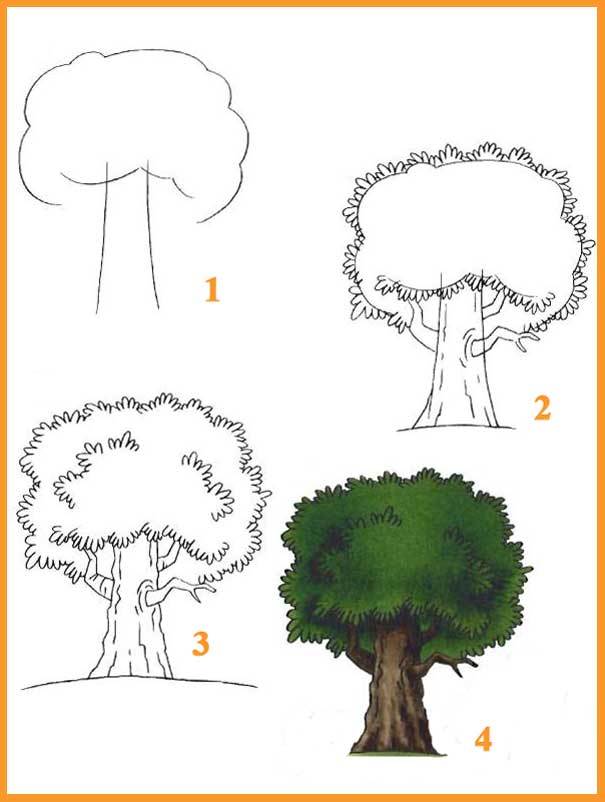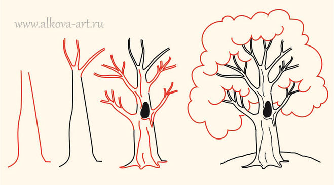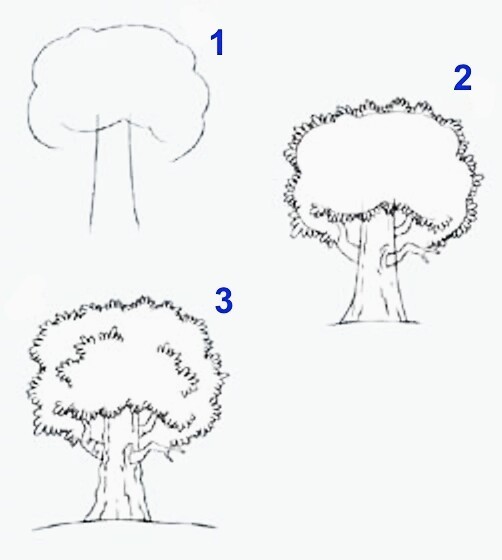 А так мы можем нарисовать поэтапно Дуб, еще один важный элемент нашего рисунка: