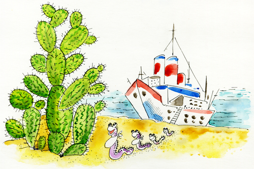 Еще более дорисовываем колючки кактусов: у того, что левее короткими линиями, посередине - группы черточек у хребтов, на высоком кактусе справа волнистыми линиями: