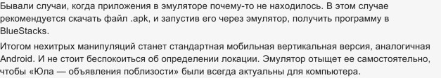 Прежде всего конечно приложение для продаж и объявлений "Юла" предназначено для переносных устройств типа планшетов и телефонов с операционной системой IOS и Андроид, ну а если вы решили пользоваться приложением "Юла" с компьютера то прежде всего придется установить эмулятор BlueStacks, а уже через него вы сможете без труда установить "Юлу" на компьютер и подать объявление на сайт.