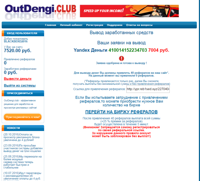 Я СТОЛКНУЛСЯ С ЭТИМ САЙТОМ. КОГДА ХОТЕЛ ПОСМОТРЕТЬ, КАК ТАМ ВЫВОДЯТ ДЕНЬГИ, ТО ХОТЕЛ ВЫВЕСТИ 500 РУБЛЕЙ(ОБ УСЛОВИЯХ ВЫВОДА НА САЙТЕ НЕТ НИ СЛОВА). МНЕ ОТВЕТИЛИ, ЧТО МИНИМАЛКА НА ВЫВОД 7000 РУБЛЕЙ. СДЕЛАЛ ЗА 4 ЧАСА ЭТИ 7520 РУБЛЕЙ. НА ВЫВОД ПОСТАВИЛ 7004 РУБ. МНЕ ОТВЕТИЛИ, ЧТО НЕОБХОДИМО ЕЩЁ 40 РЕФЕРАЛОВ. И НЕНАВЯЗЧИВО ПРЕДЛОЖИЛИ ПРОЙТИ К НИМ НА БИРЖУ РЕФЕРАЛОВ И КУПИТЬ ИХ ЗА НАЛИЧНЫЕ ДЕНЬГИ. РЕКЛАМА КРУТИТЬСЯ ОДНА И ТА ЖЕ, БАННЕРОВ 20, ТОЛЬКО МЕСТАМИ МЕНЯЮТСЯ. А КОГДА Я НАЧАЛ В ИХНЮЮ СЛУЖБУ ПОДДЕРЖКИ НАСЧЁТ ВЫПЛАТЫ ПИСАТЬ, ТО МЕНЯ СОВСЕМ ЗАБЛОКИРОВАЛИ И ДЕНЕГ НЕ ОТДАЛИ. ТАК ЧТО, ЛЮДИ, НЕ ЛЕЗЬТЕ НА ЭТОТ САЙТ, ЛОХОТРОН!!!!!!!!!!! ЕСЛИ КТО ПОЙДЁТ НА ЭТОТ САЙТ, ТО В СЛУЖБУ ПОДДЕРЖКИ ПЕРЕДАЙТЕ ПРИВЕТ ЭТИМ ВОРЮГАМ ОТ BLACKBERD2016. ЛОХОТРОНИЩЕЕЕЕЕЕЕЕ!!!!!!!!!