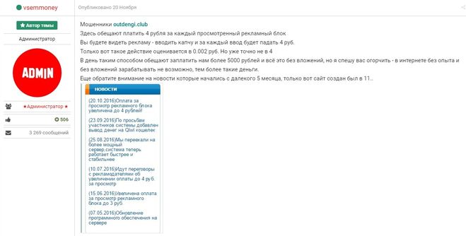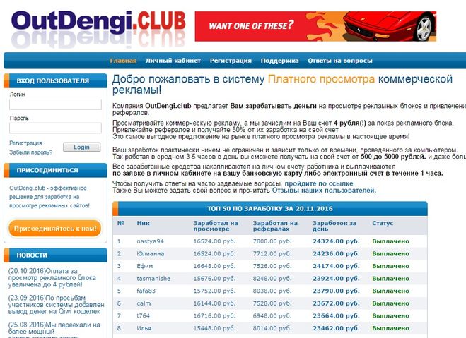 Те заоблачные деньги, которые предлагает сайт outdengi.club (достаточно посмотреть таблицу "лидеров" с их среднесуточным "заработком" в 20-25 тысяч рублей), конечно же никто не платит. Легких денег не бывает, а за простой просмотр рекламы - тем более.