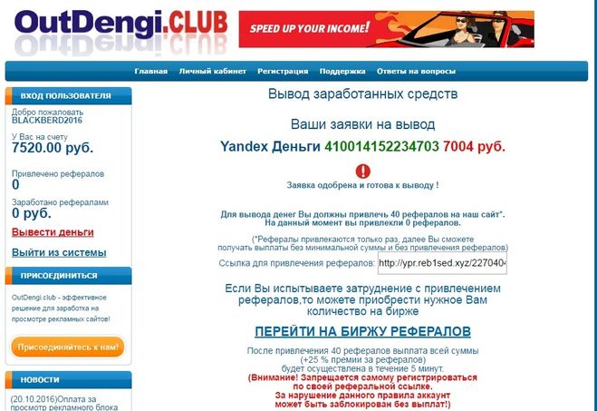 И вдобавок советуют купить рефералов на внутренней бирже (внутри самого сайта). Деньги в результате уходят на кошелек мошенника-админа outdengi.club и на этом все заканчивается. А для вас начинается осознание происходящего - вас кинули.