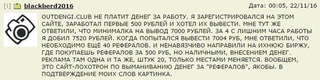 Это чистой воды грязный лохотрон. Админ создал несколько десятков однотипных сайтов в домене club (в том числе и этот свой outdengi.club, а когда доходит дело до выплаты, предлагается пользователям привезти рефералов (новичков, авось кто-то из них купится на этот обман в интернете).