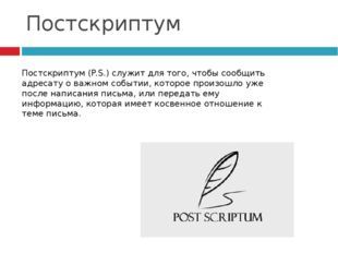 Значение постскриптума - указывать читающему на информацию, которую автор размещает для его внимания уже в конце письма, после основного текста, прощания, подписи.