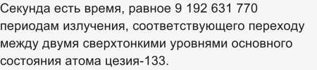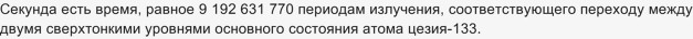 Одна секунда. Представляет собой интервал времени, равный 9 192 631 770 периодам излучения, соответствующего переходу между двумя сверхтонкими уровнями основного состояния атома цезия-133, находящегося в покое при 0 К. Кстати, в большинстве других систем, тоже принимается за единицу времени. Так что можно не заморачиваться.