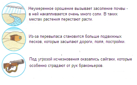 Второе изображение показывает как из-за сокращения численности растений появляется большое количество песков, которые нечем удерживать - отсутствуют кустарники и травы, которые могли б воспрепятствовать их перемещению ветрами. В итоге, из-за выпаса скота люди в итоге уничтожают даже свои обжитые места, так как защитится от песков становится почти невозможно.