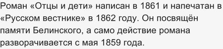 Роман "Отцы и дети" был написан в память о Белинском. Тургенев и Белинский познакомились в 1843 году. С тех пор они подружились, часто общались, разговаривали. Было у них много общего. Длилась дружба почти пять лет, до самой смерти Белинского. Эта дружба стала началом внутреннего перелома Тургенева, изменила его взгляды на произведения и людей.