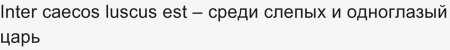 Пословица на латыни Inter caecos luscus rex, в переводе "Среди слепых одноглазый – король". На самом деле это персидская пословица, которая дошла до наших дней, звучит дословно следующим образом "В царстве слепых одноглазый — король". У каждого народа есть мудрые изречения, каждый народ веками накапливал знания и устное народное творчество сохранило до наших дней умные мыли. Аналогов русских пословиц много, например, про голову мухи, что лучше быть головой мухи, чем быть задом слона.