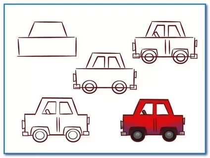 Эти варианты сложные. Для ребенка можно предложить машинку на основе прямоугольника, который нужно поделить на части. В них проще нарисовать машину по частям - колеса, двери и окна.
